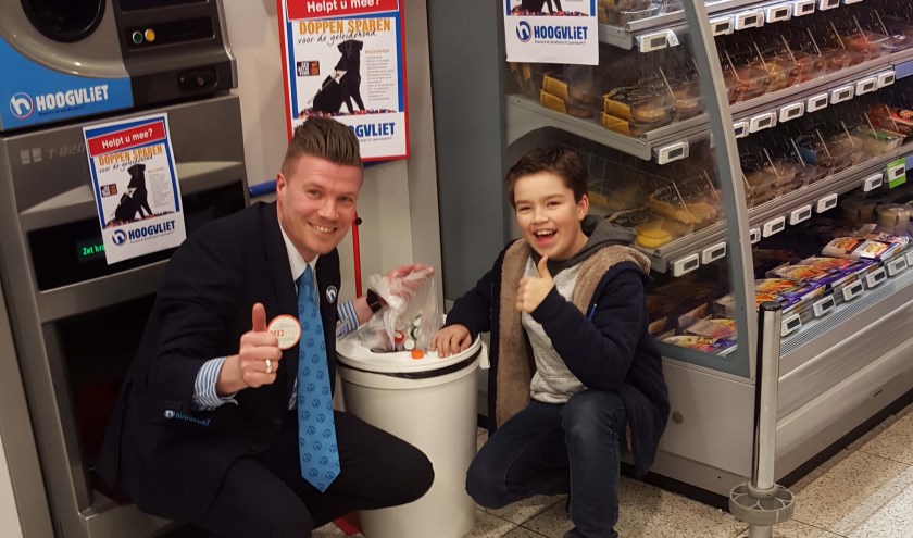 Op verzoek van de 11-jarige Daan den Dekker heeft de Hoogvlietsupermarkt in Bilthoven zich aangemeld als inzamelpunt voor plastic doppen ten behoeve van KNGF Geleidehonden.